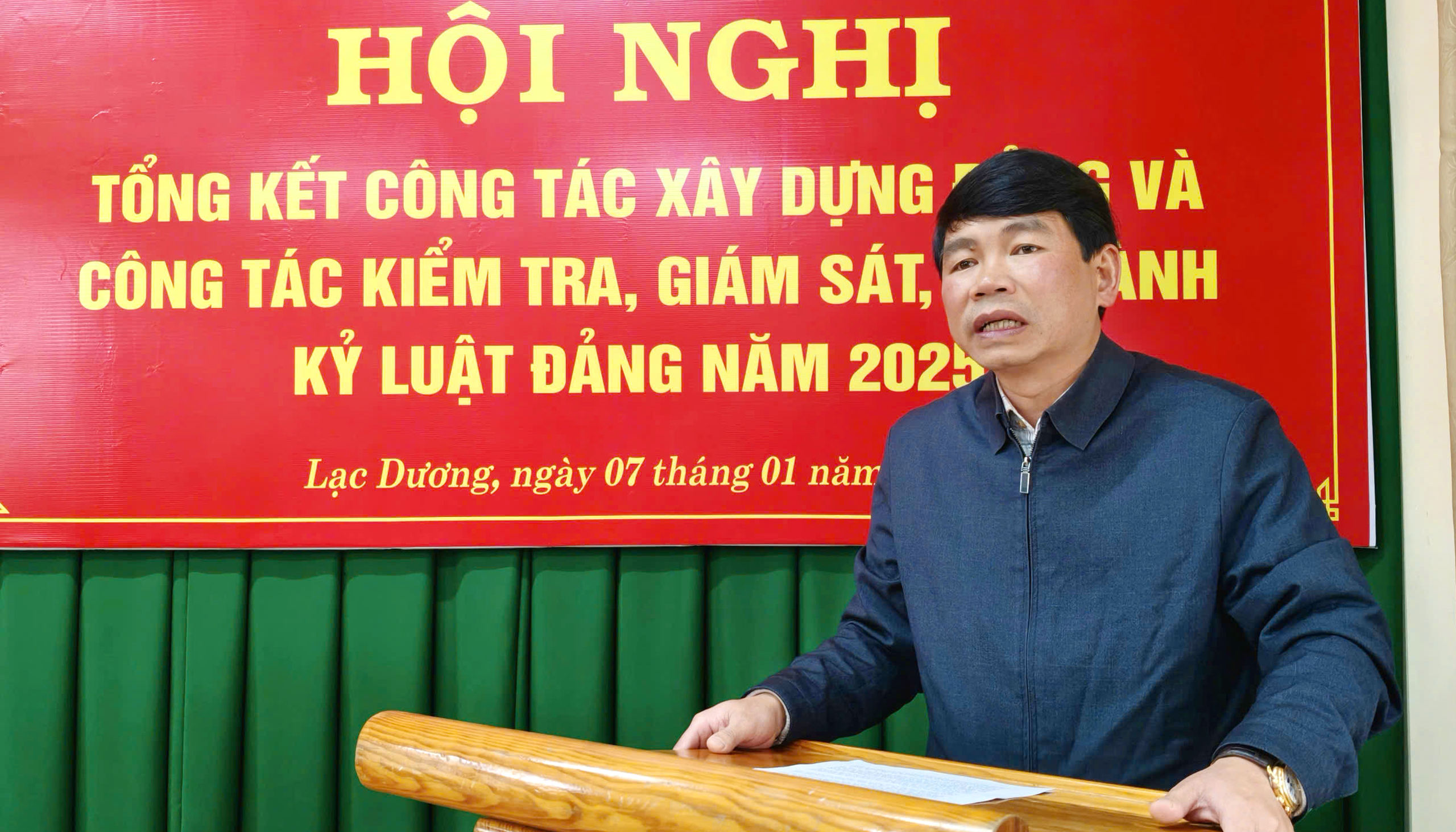 Chiều ngày 07/01/2025, dưới sự chủ trì của đồng chí Bùi Quốc Huân, Phó Bí thư Đảng ủy, Bí thư Đảng ủy Ủy ban nhân dân, Chủ tịch UBND xã và đồng chí Cil Khiuh, Phó Bí thư Đảng ủy Ủy ban nhân dân, Phó Chủ tịch UBND xã; Đảng ủy Uỷ ban nhân dân (UBND) xã Lạc Dương tổ chức Hội nghị Tổng kết công tác xây dựng Đảng và công tác kiểm tra giám sát thi hành kỷ luật Đảng năm 2025; triển khai nhiệm vụ năm 2026. Tới dự và chỉ đạo hội nghị có đồng chí Ya Tiong, Bí thư Đảng ủy xã Lạc Dương.