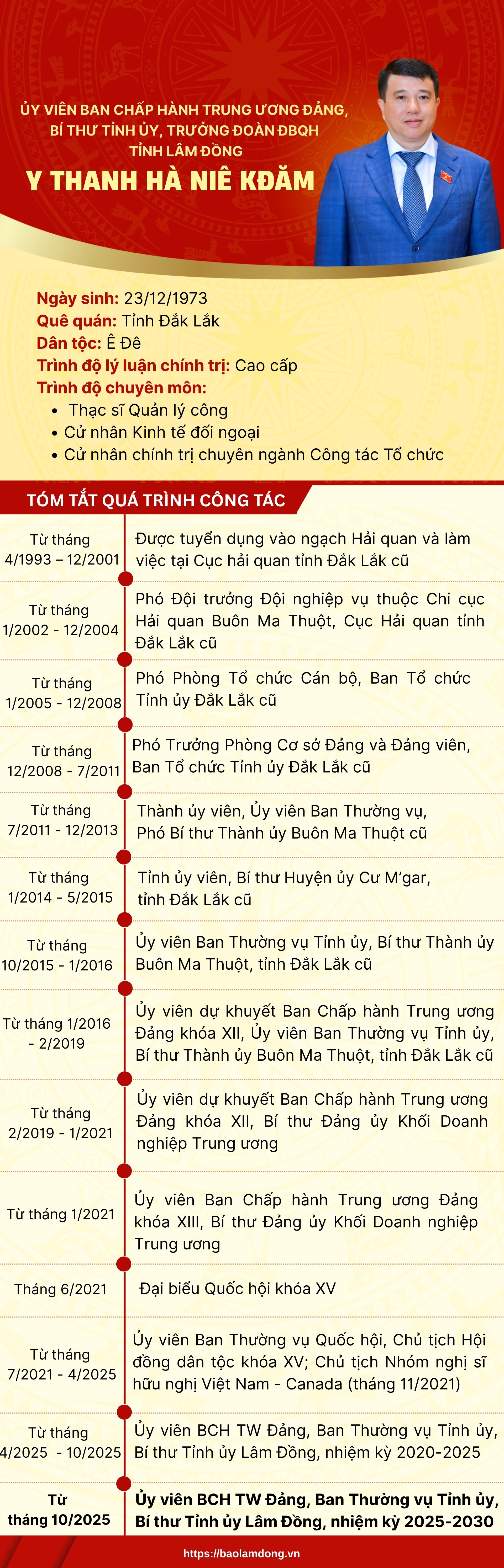 Tại phiên chính thức Đại hội đại biểu Đảng bộ tỉnh Lâm Đồng diễn ra vào sáng 10/10, đồng chí Y Thanh Hà Niê Kđăm, Ủy viên Ban Chấp hành Trung ương Đảng, Bí thư Tỉnh ủy nhiệm kỳ 2020 - 2025, Trưởng Đoàn ĐBQH tỉnh khóa XV đã được Bộ Chính trị chỉ định giữ chức Bí thư Tỉnh ủy nhiệm kỳ 2025 - 2030.